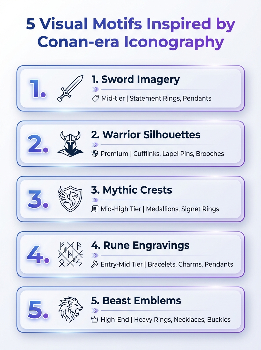 Explore five visual motifs drawn from Conan-era iconography. This infographic highlights symbols, color palettes, and stylistic cues that define the film's legendary visual language.